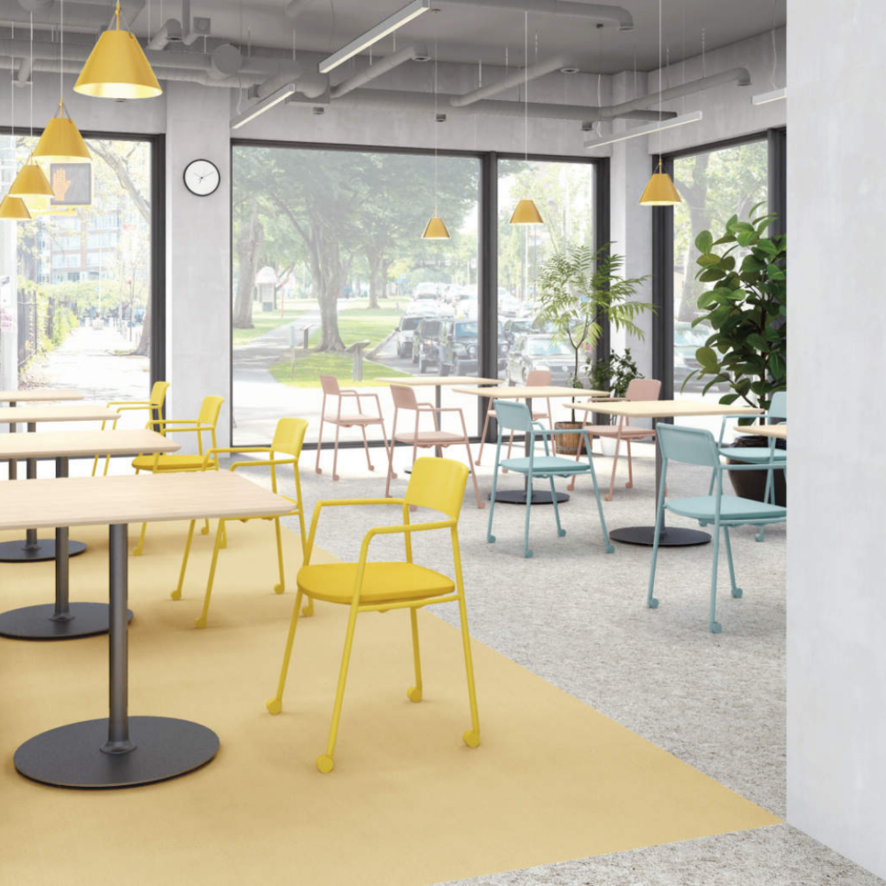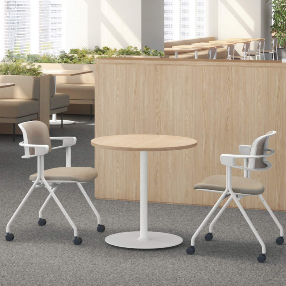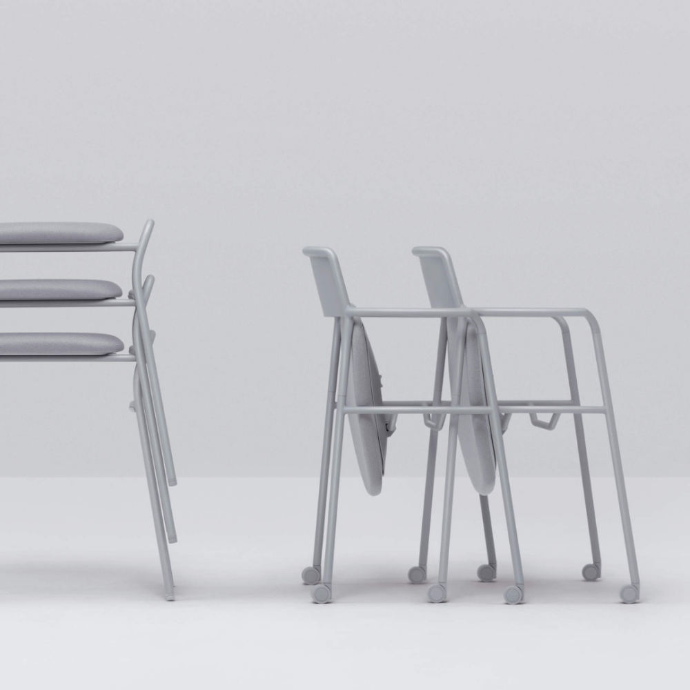 座面を跳ね上げれば水平にスタッキング(収納)でき、急なレイアウト変更や掃除の際もスムーズに移動できます。