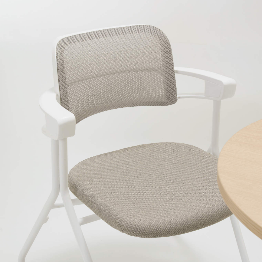 ■ 空間を洗練させるデザインと収納力 圧迫感のないメッシュバックと、特徴的なループ形状のアームが織りなす軽快なデザイン。