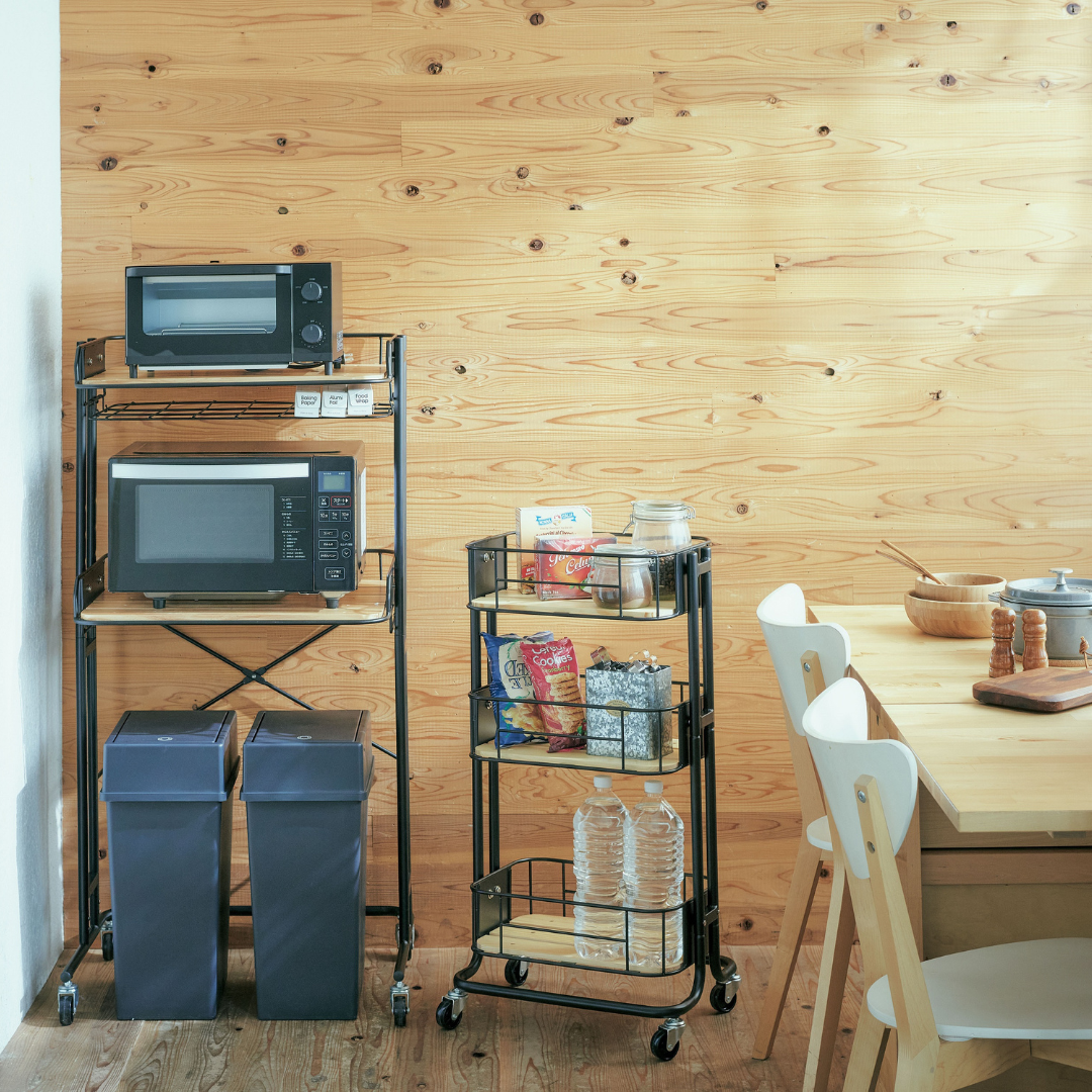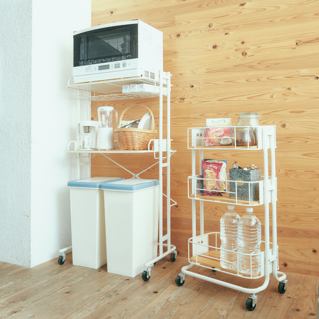 電子レンジや電気ポット、ゴミ箱をまとめて設置可能。限られたスペースでも整理された印象を保てます。