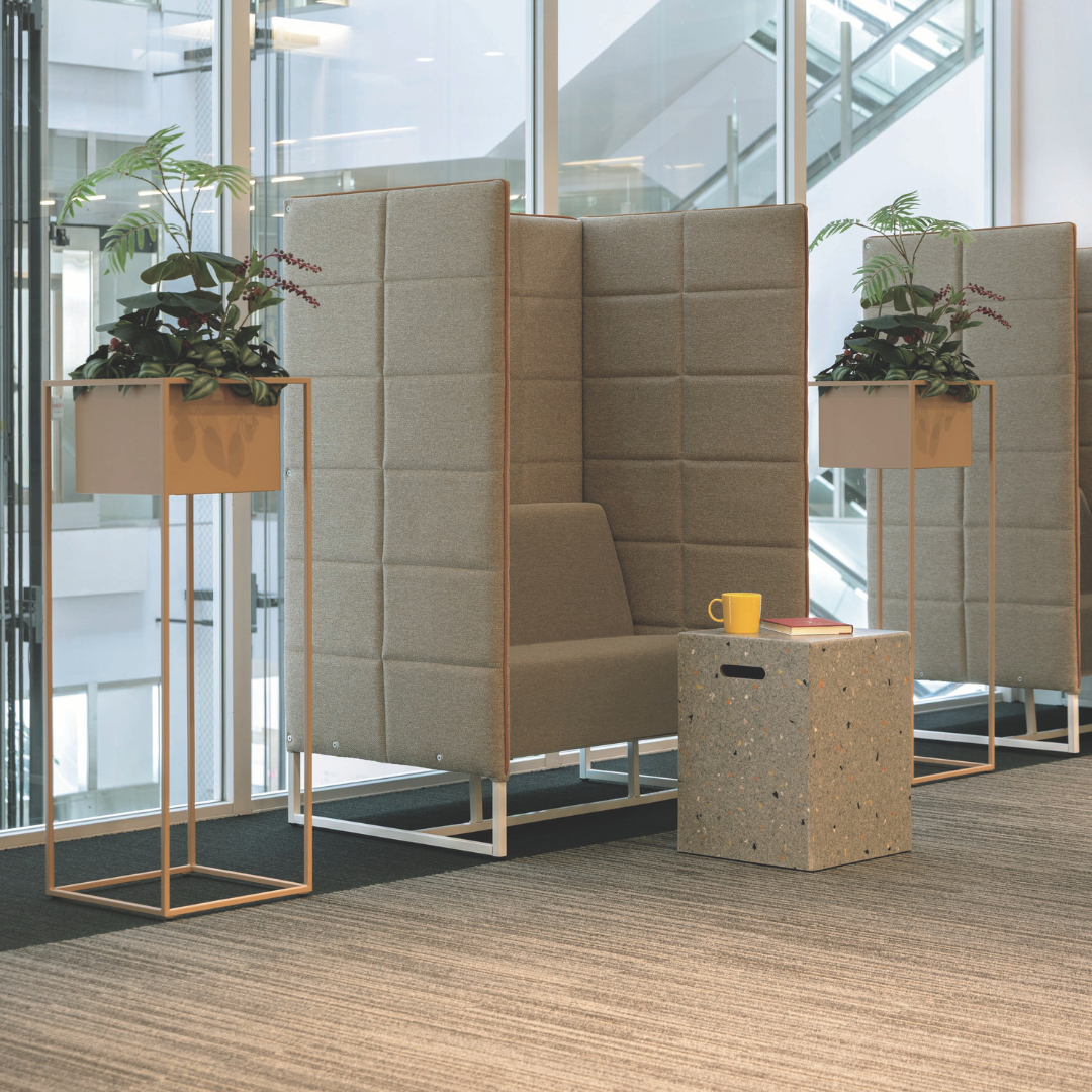 ファブリック張りのパネルと座面が空間に温かみを与え、スチールフレームが全体を引き締めます。