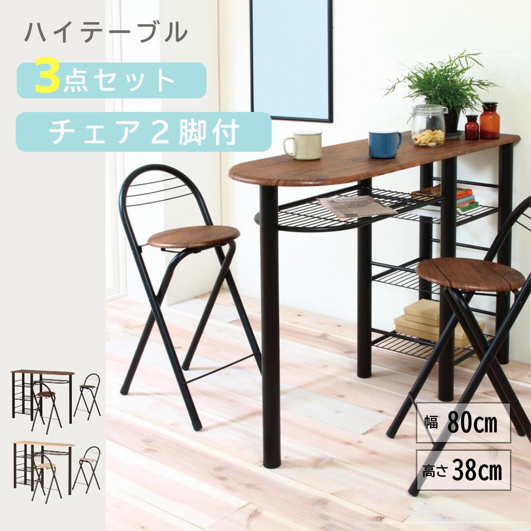 弘益 ハイテーブル 3点セット カウンターテーブル ハイチェア 2脚 折畳椅子 フォールディングハイチェア 収納棚付き