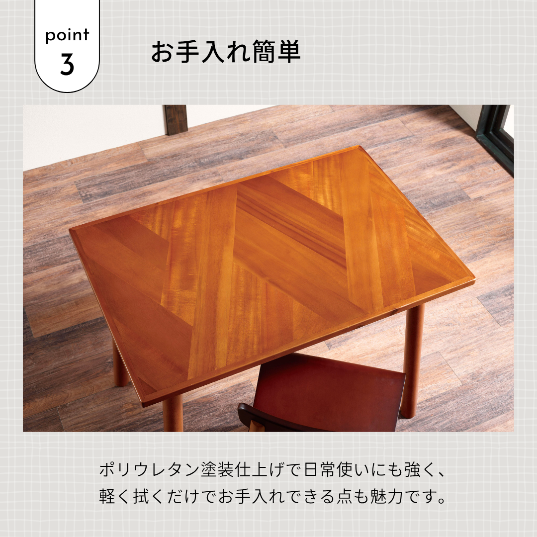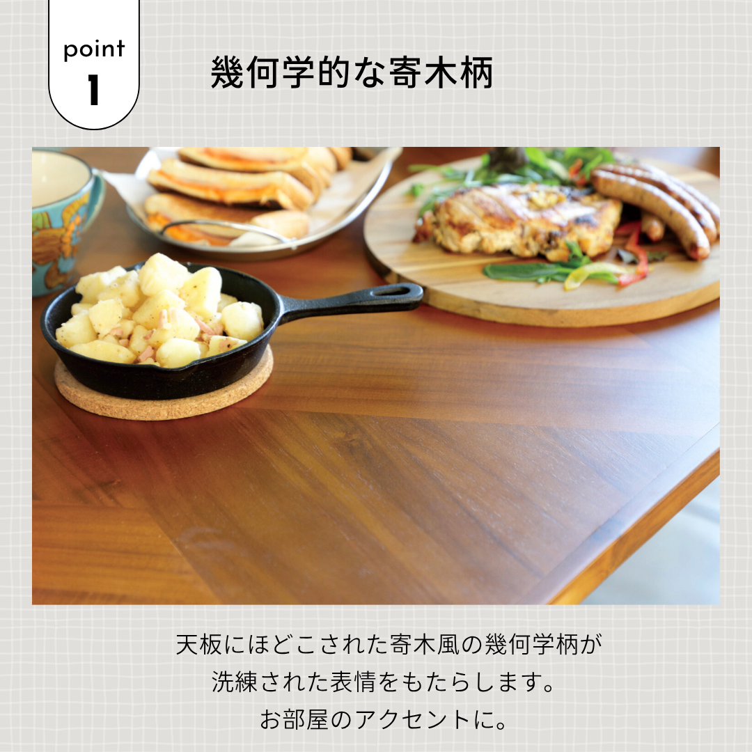 寄木(よせぎ)調の幾何学パターンが美しく映える、上質なデザインテーブル。