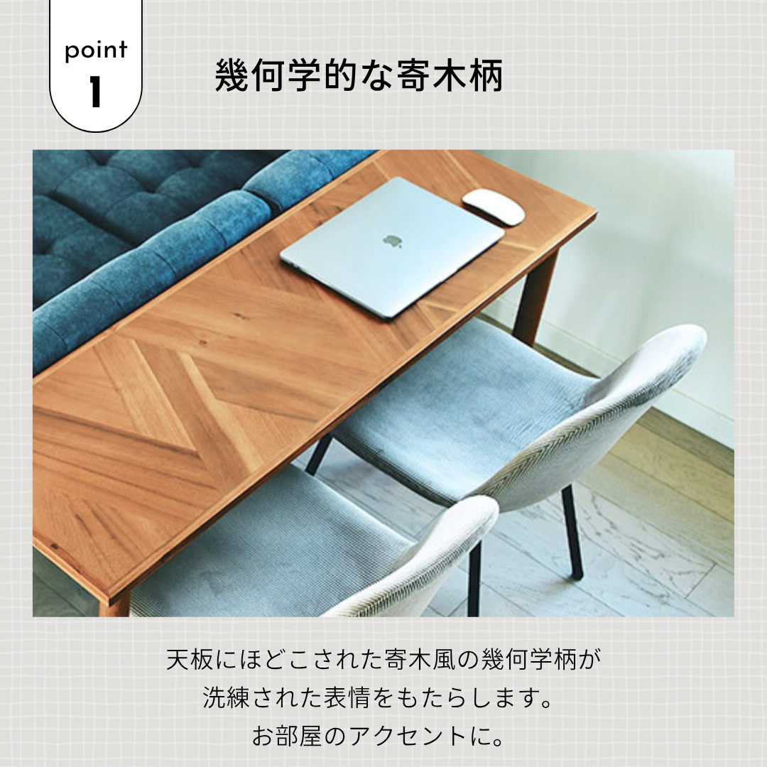寄木(よせぎ)調の幾何学パターンが映える、ヘリンボーンデザインのロングデスク。