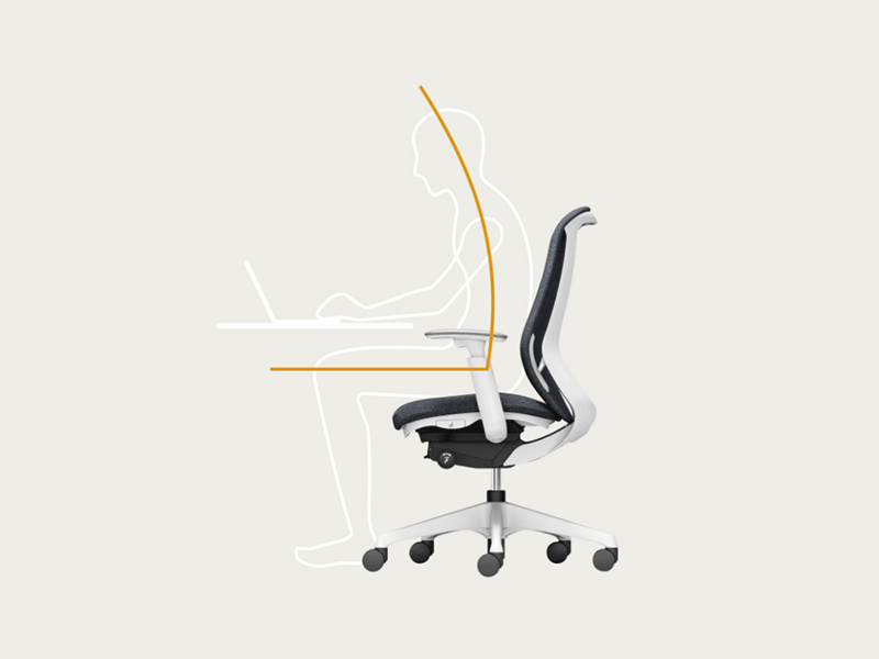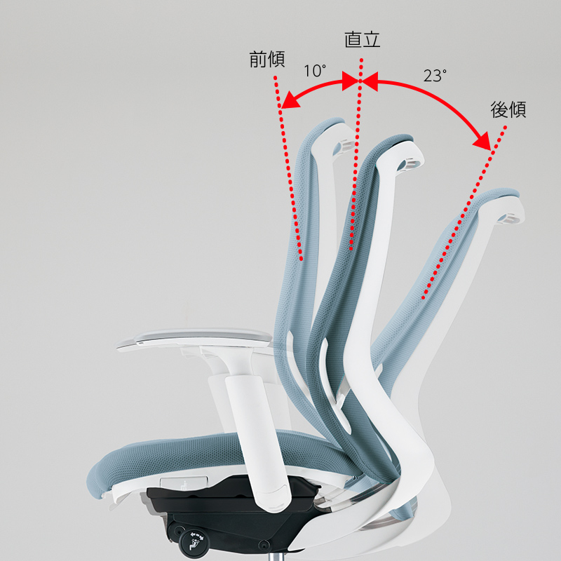 直立姿勢から後傾姿勢のリクライニングに加え、パソコン・筆記作業に適した前傾ポジションをとることが可能です。