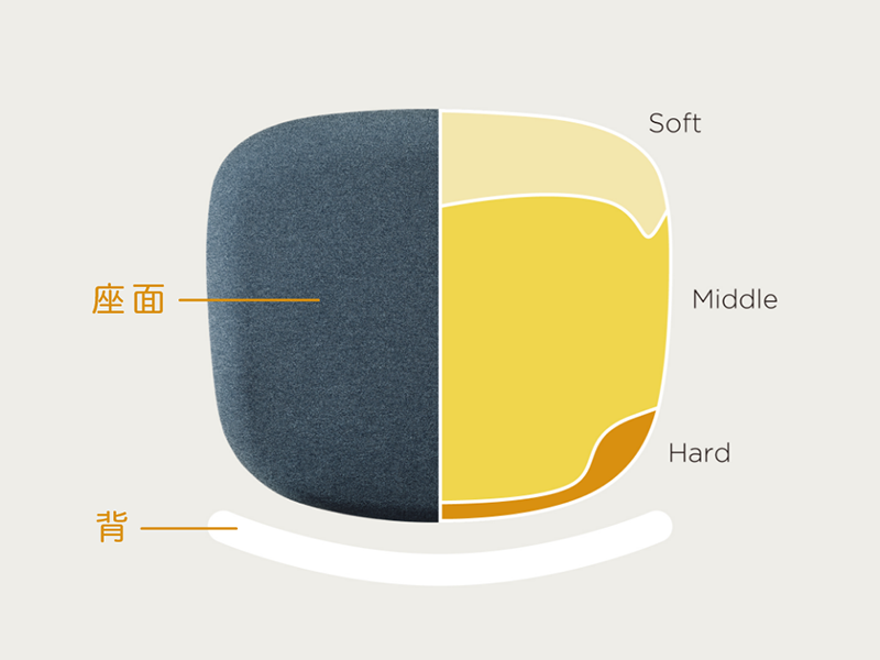 後方には、お尻をし っかりサポートする硬めのクッションを採用しました。