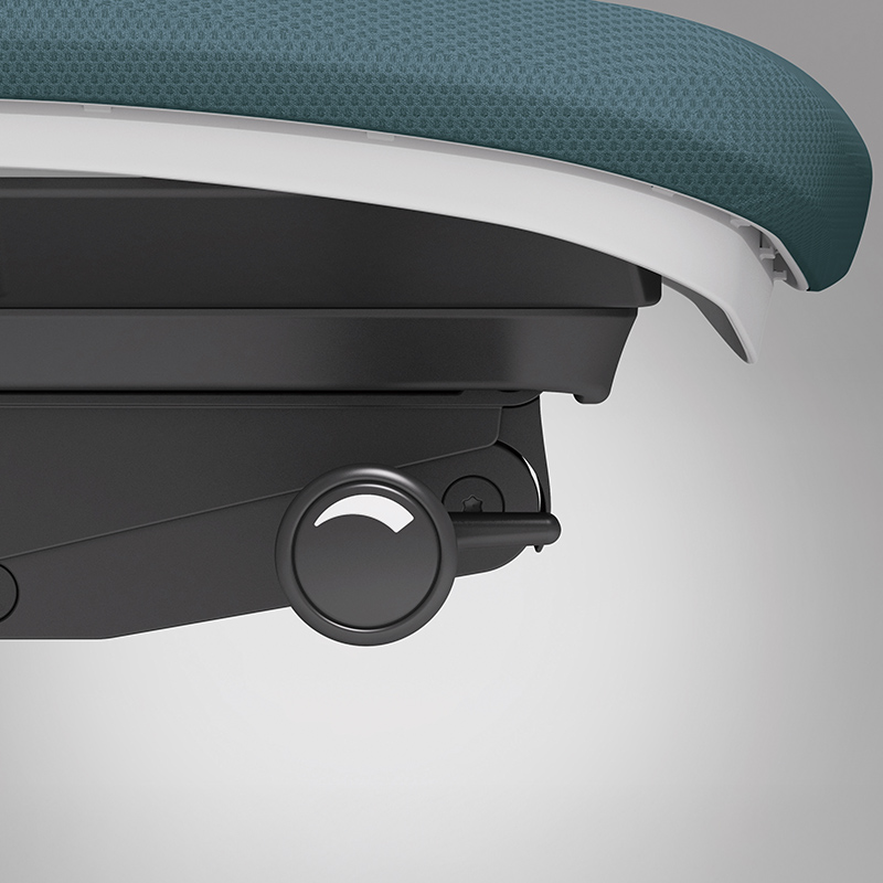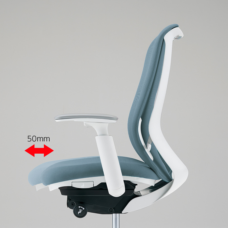 座面の左にあるレバー操作により、座面の奥行き調節が可能です。(ストローク:50㎜)