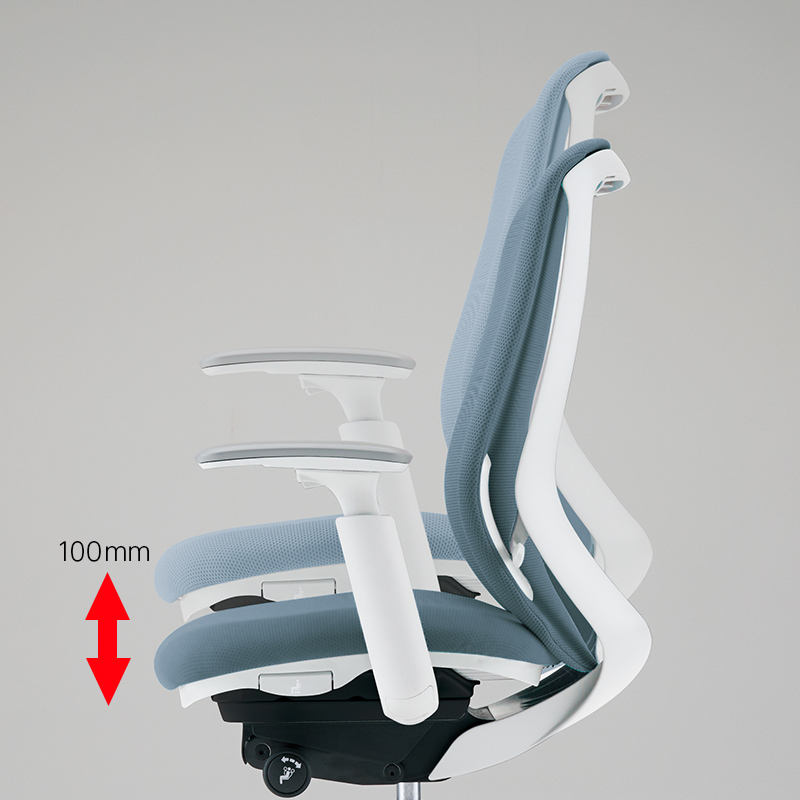 座面の右下にあるレバーを持ち上げることで、座面の高さ調節が可能です。(ストローク:100㎜)
