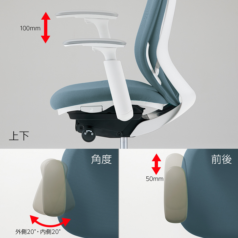 また、肘パッドは前後に50㎜、内側に20°、外側に20°動かすことができます。