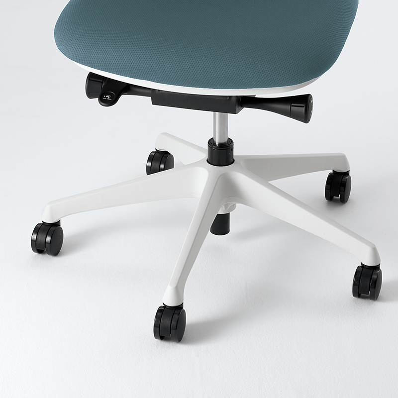 座面左下のダイヤルでリクライニングの固定と解除が行えます。背と座はシンクロしてリクライニングし、従来の直立から後傾までのリクライニングに加え、パソコン作業や筆記作業時の前傾姿勢をサポートする「前傾ポジション」をとることが可能です。