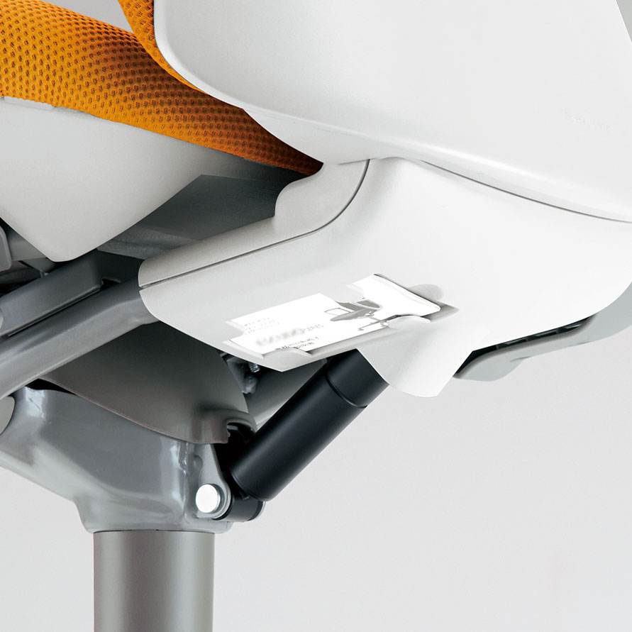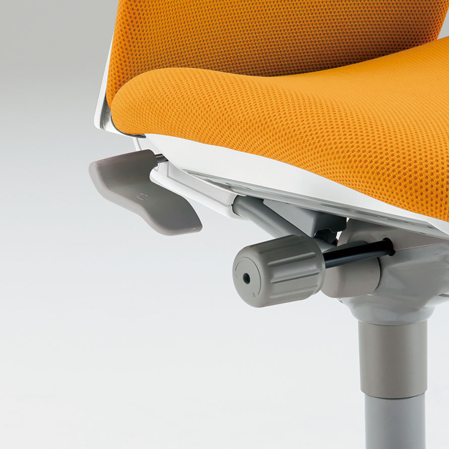 座面の左下のレバーにより、上下92㎜の範囲で無段階に高さ調節が可能です。