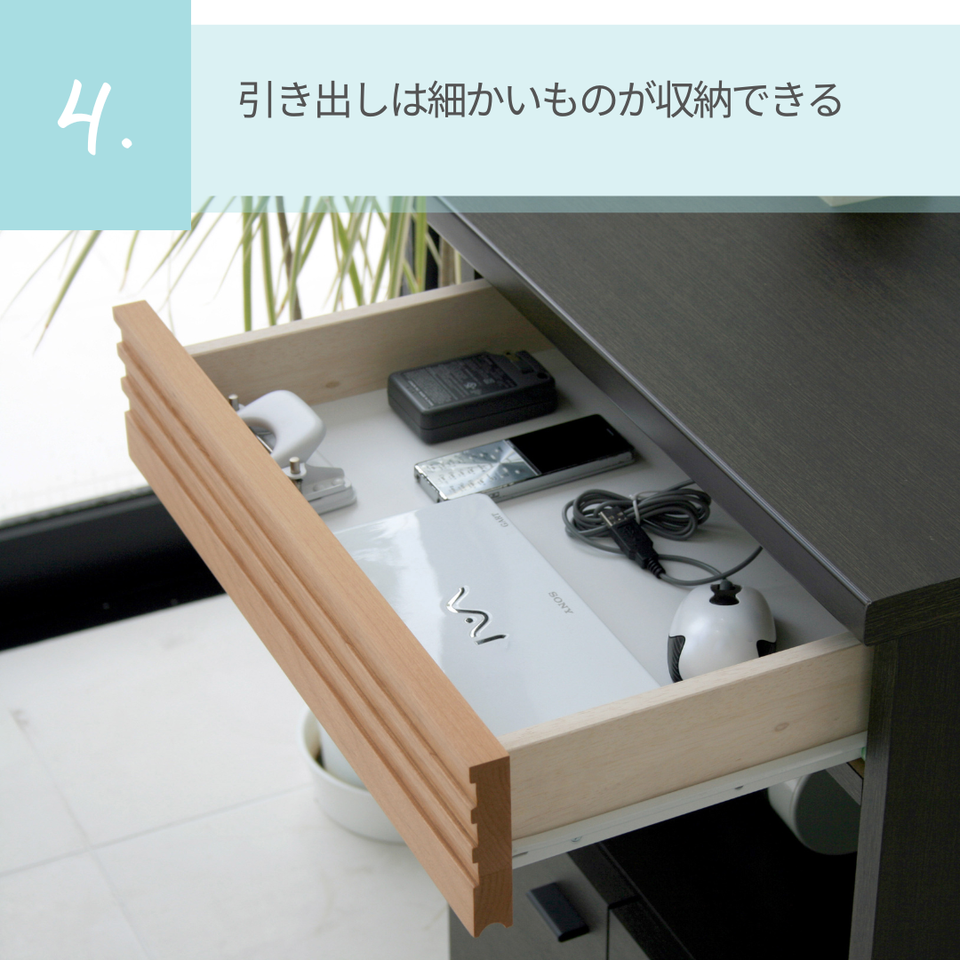 収納部には書類や消耗品、小物類をまとめて収納でき、作業スペースをすっきりと整えます。