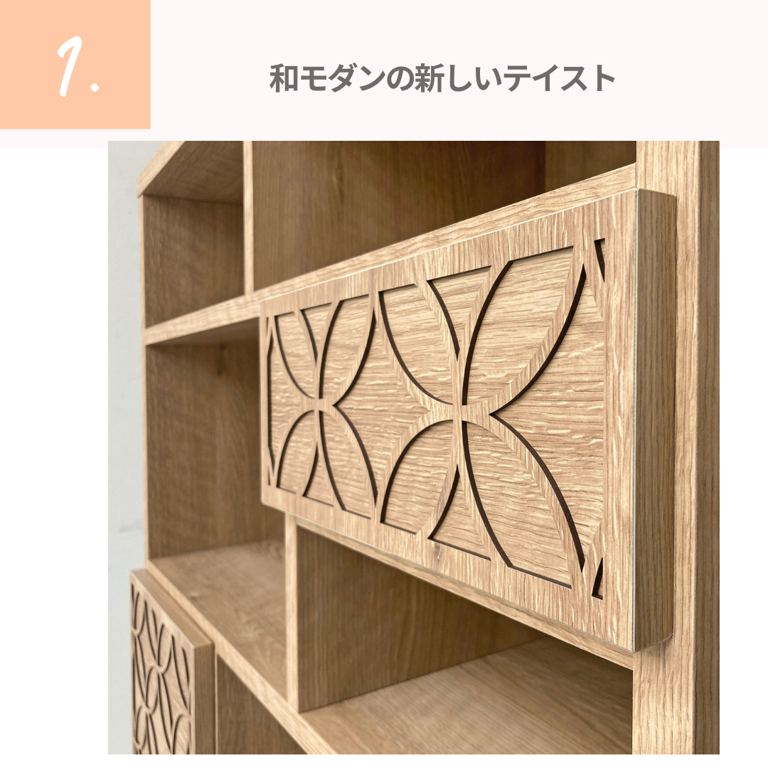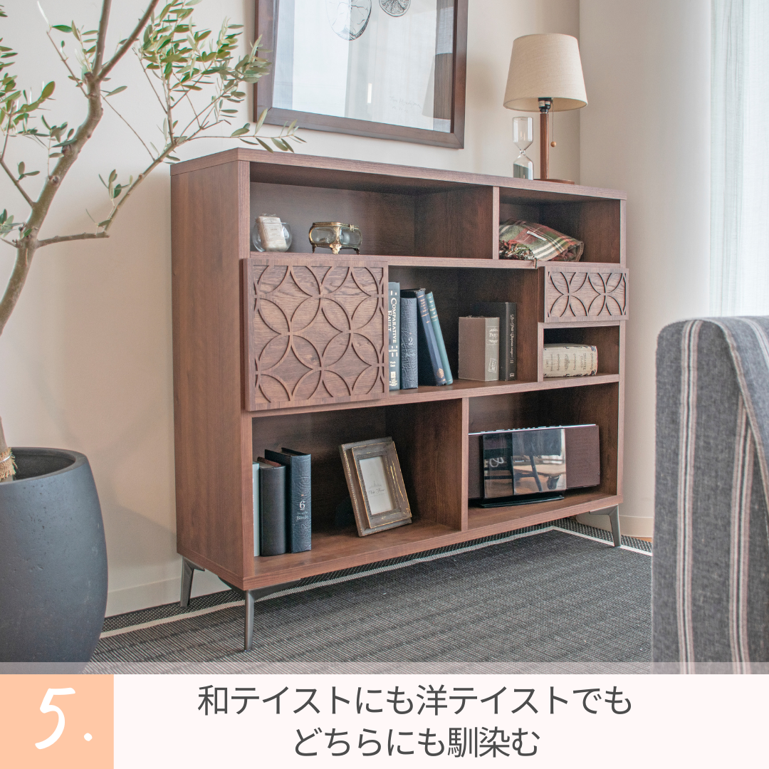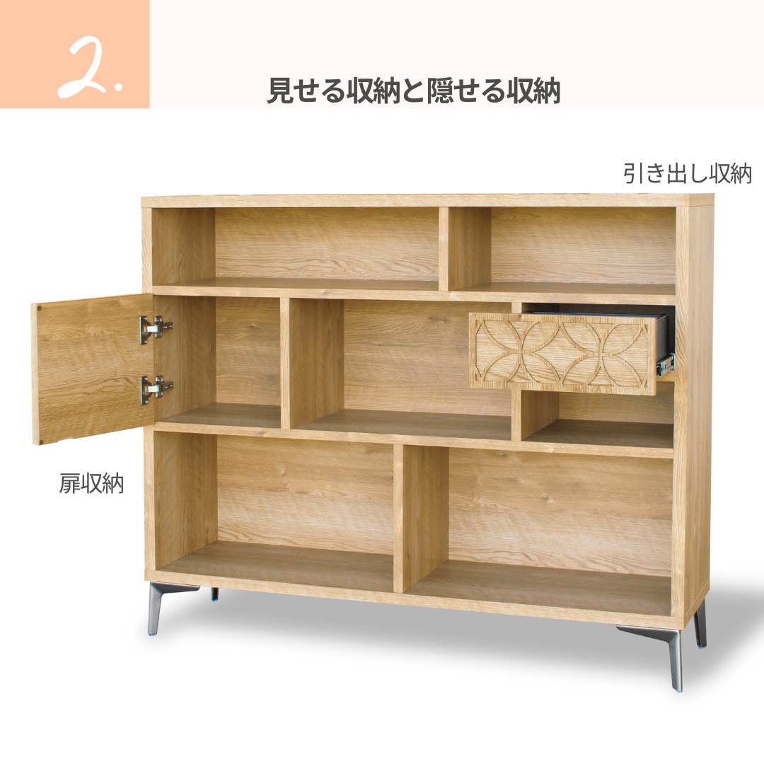 幅120cmのワイドサイズにより、収納力が高く、ディスプレイ棚としても優れたバランスを実現しています。