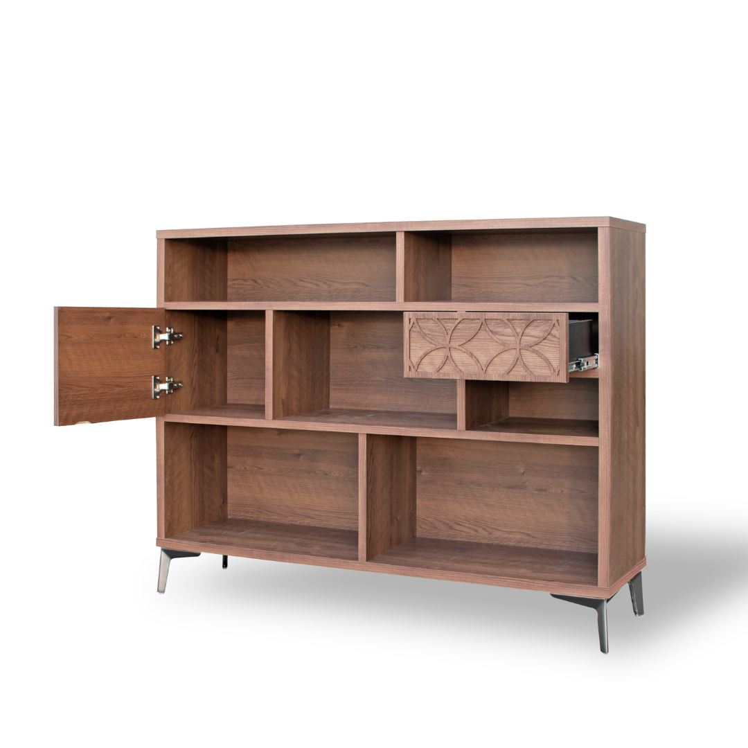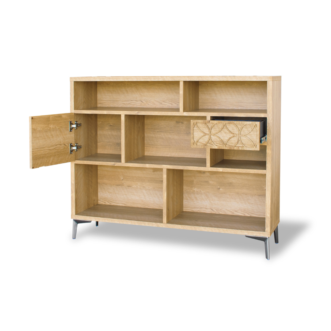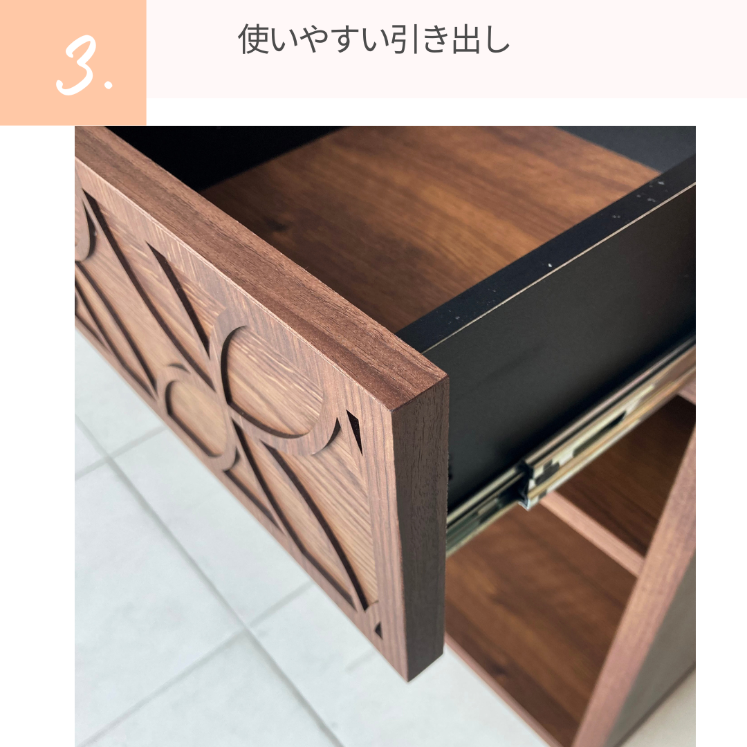幅120cmのワイドサイズにより、収納力が高く、ディスプレイ棚としても優れたバランスを実現しています。