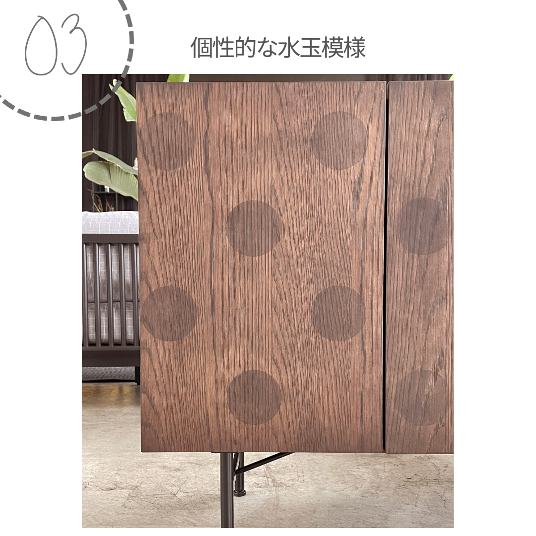最大の特長は、オーク突板の前板に施されためずらしい水玉模様。