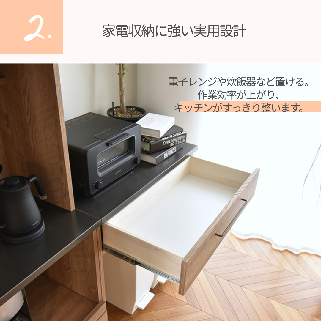 一部モデルにはスライドテーブル付きで、炊飯器やポットの使用時も快適です。