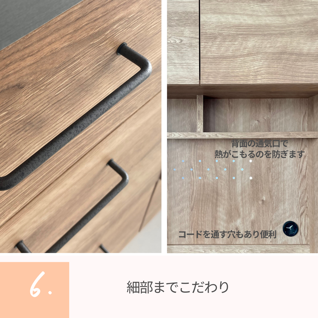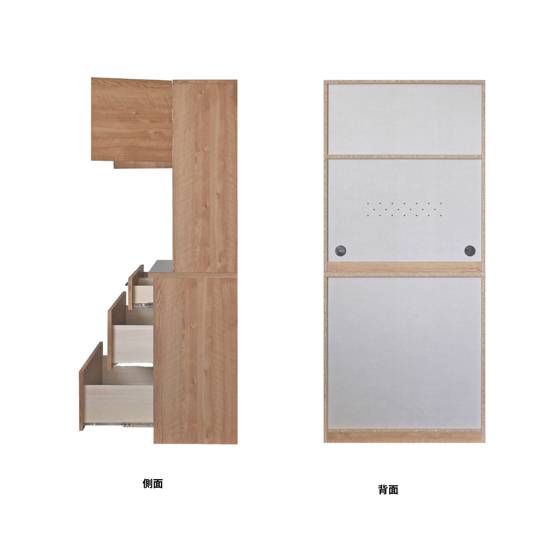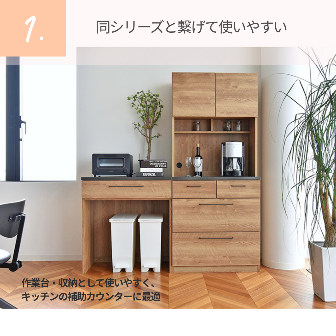ナチュラル・ブラウンの木目調デザインは、北欧・ナチュラル・シンプルモダンなインテリアに調和し、30〜40代の暮らしと仕事を支える実用性の高いキッチン収納です。