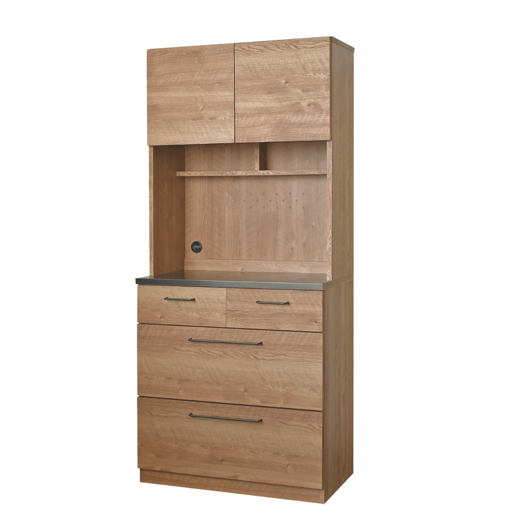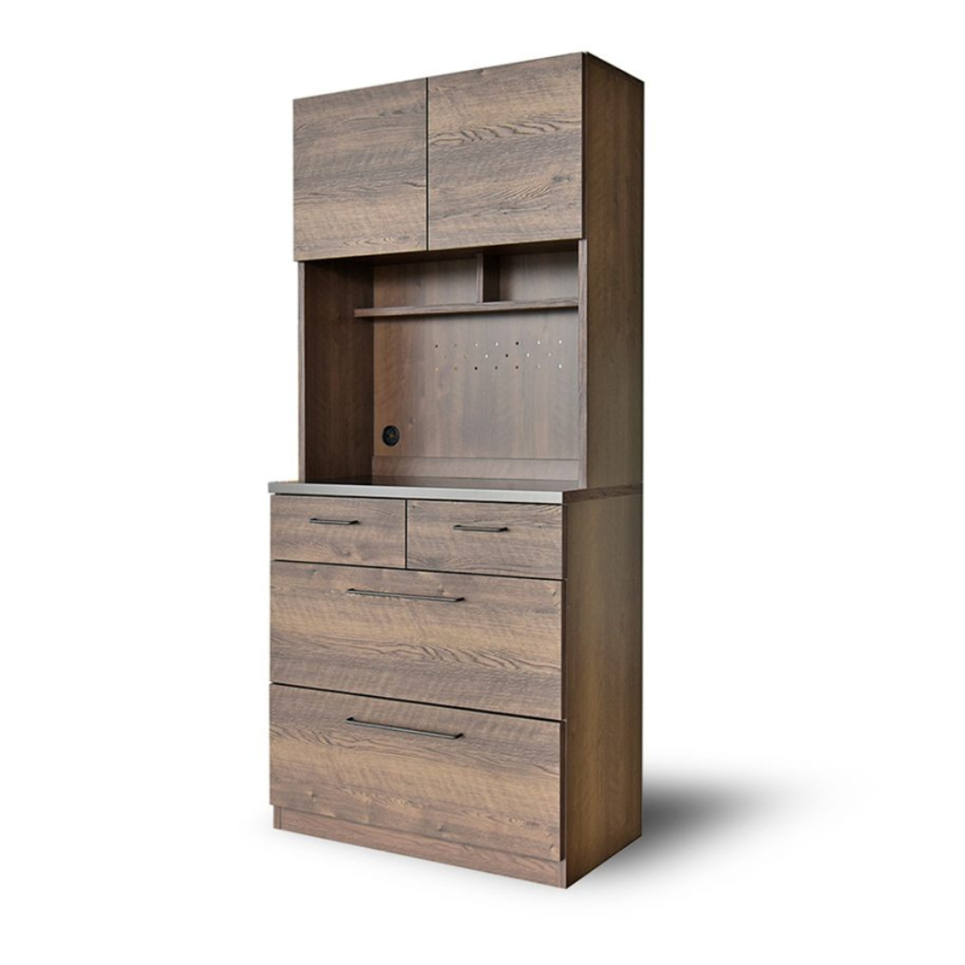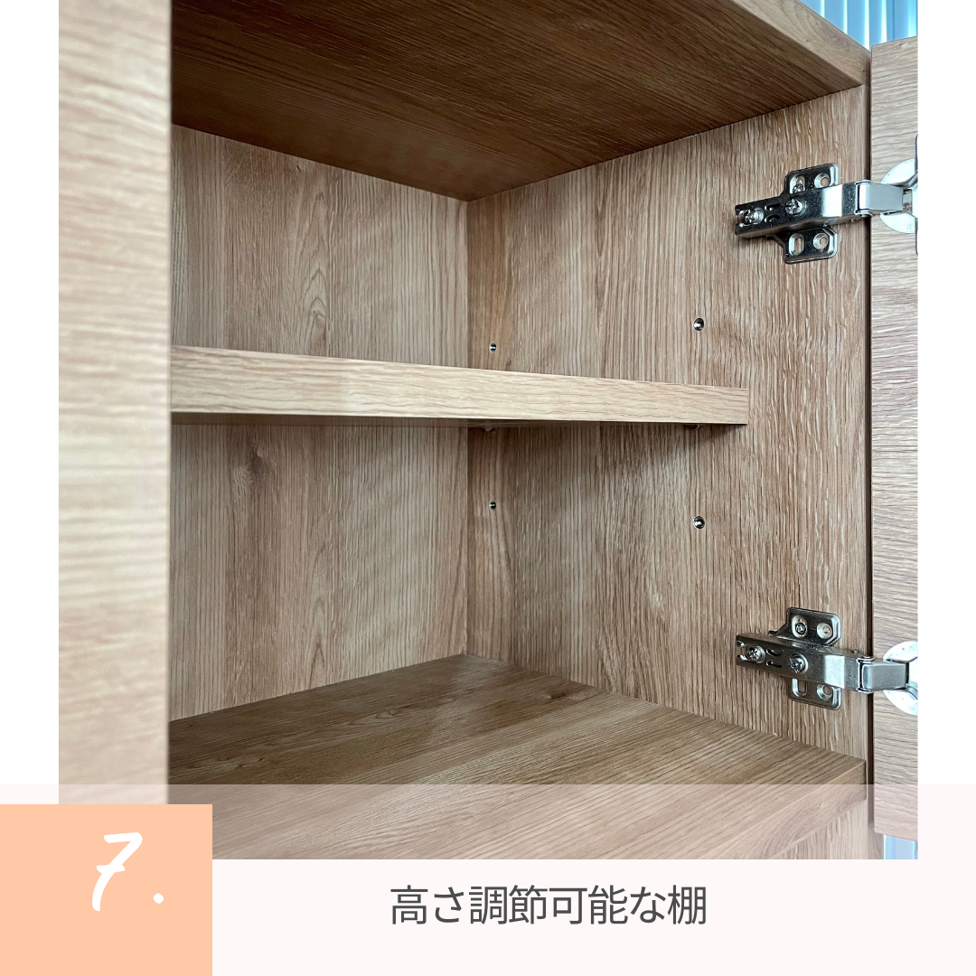ナチュラル・ブラウンの木目調デザインは、北欧・ナチュラル・シンプルモダンなインテリアに調和し、30〜40代の暮らしと仕事を支える実用性の高いキッチン収納です。