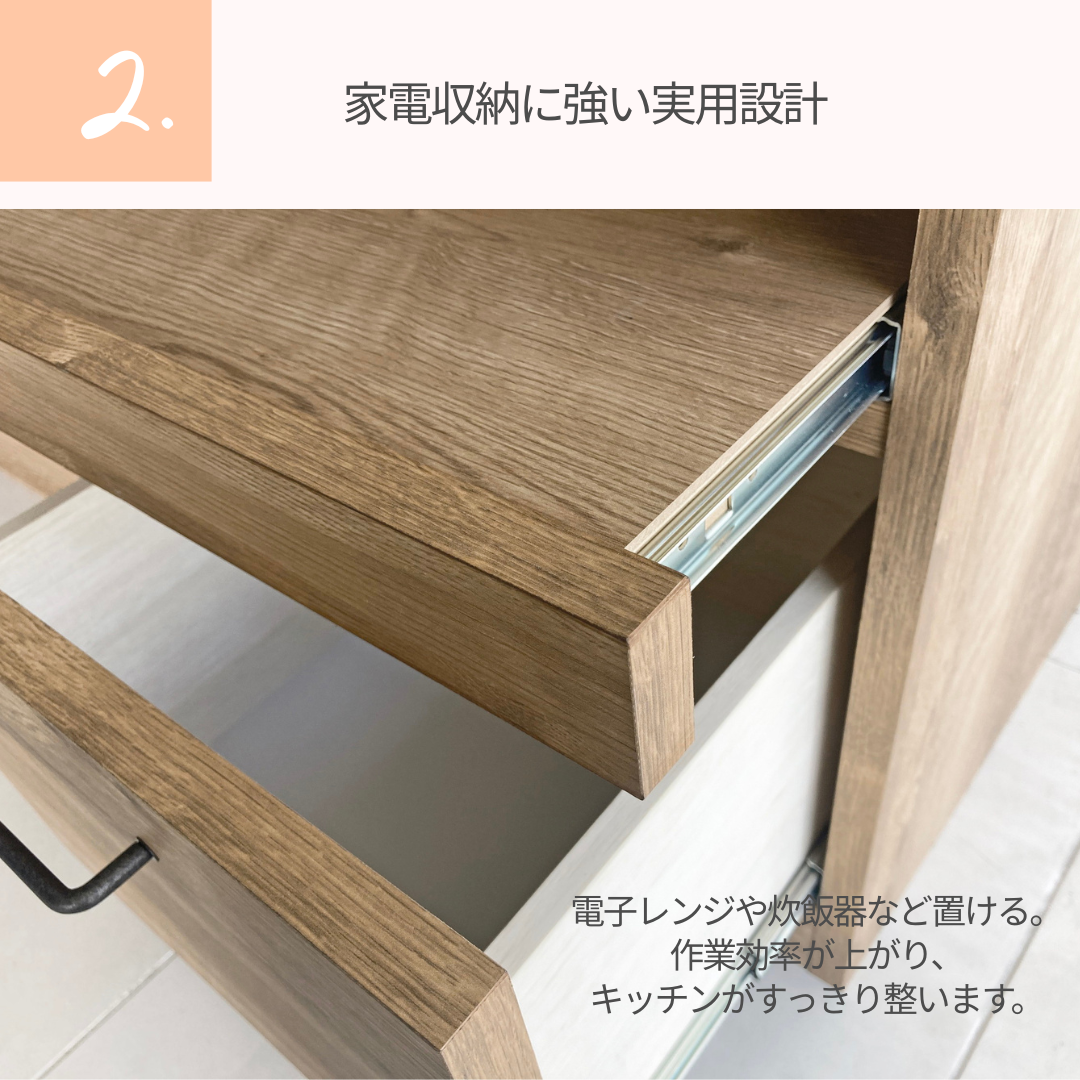 電子レンジや調理家電を設置できる天板には、汚れや熱に強い特殊スチールプレートを採用し、毎日の使用も安心です。