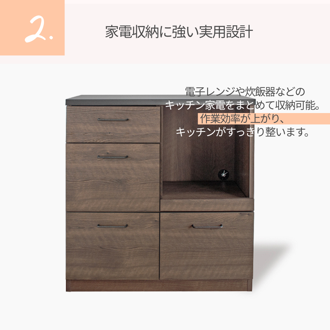 幅80cmで作業スペースと収納力を兼ね備えたキッチンカウンター。