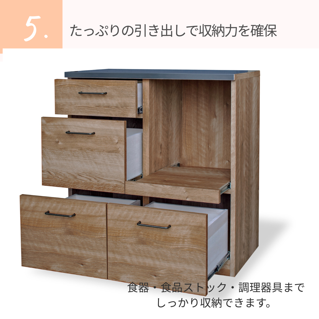 扉収納と引き出し収納を備え、食器や調理用品、ストック品までまとめて整理可能。