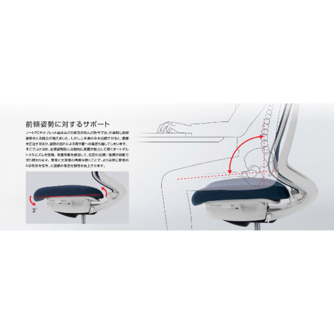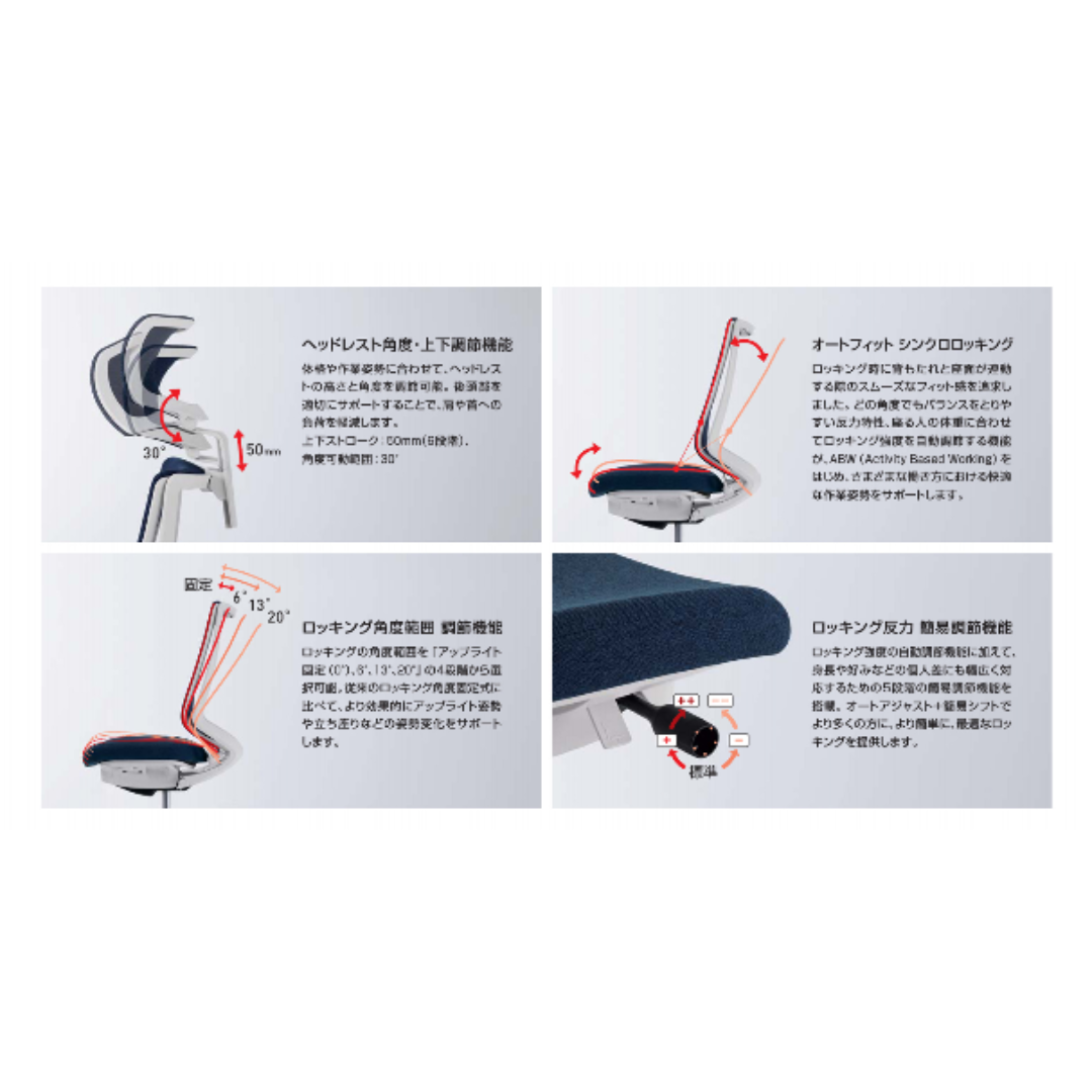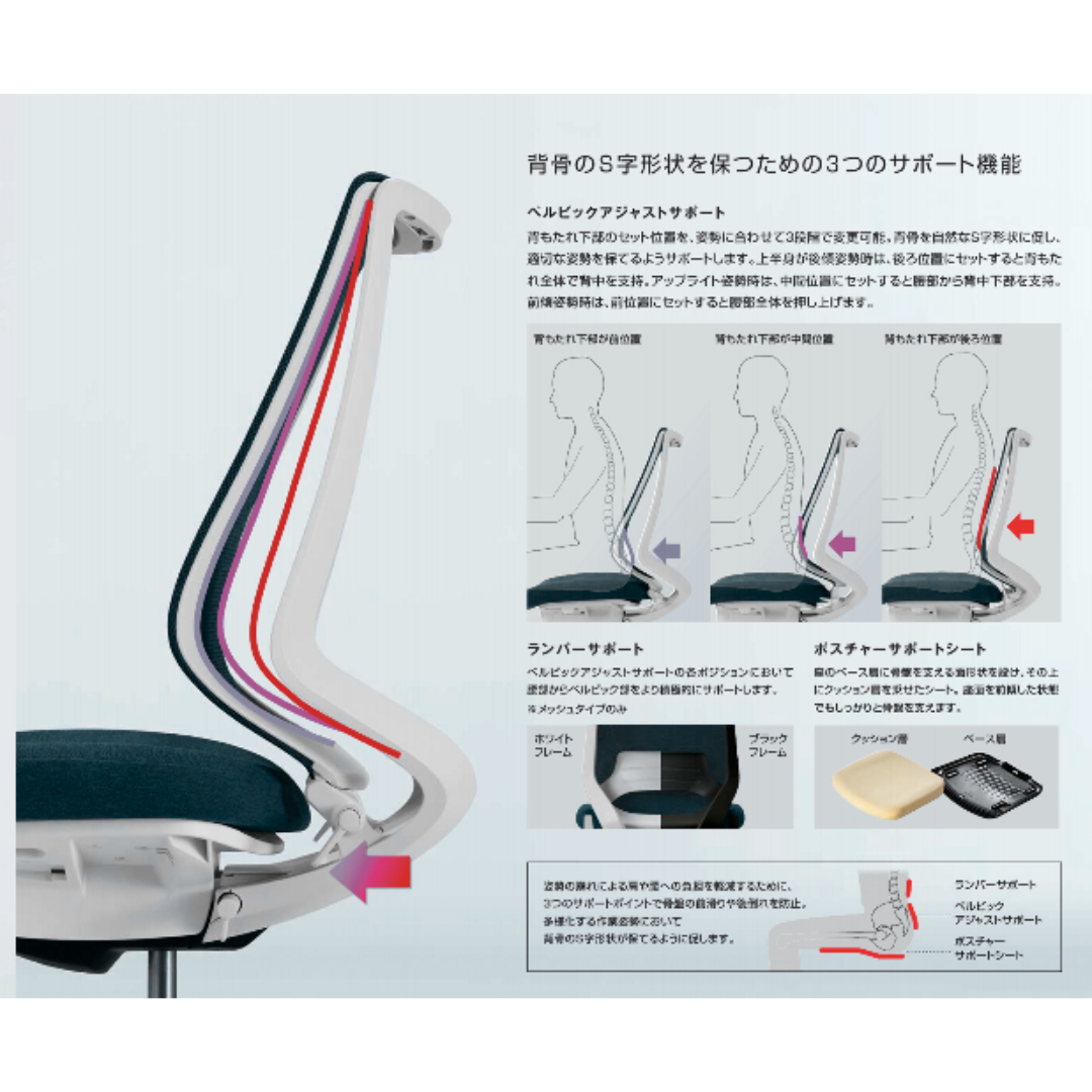 骨盤を支えるペルビックアジャストサポートと、体の動きに自然に追従するオートフィットシンクロロッキングにより、無理のない姿勢をキープ。