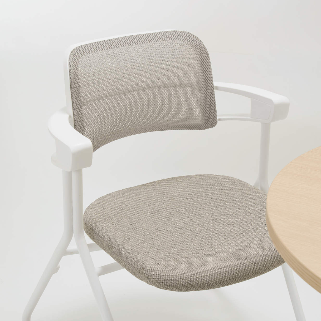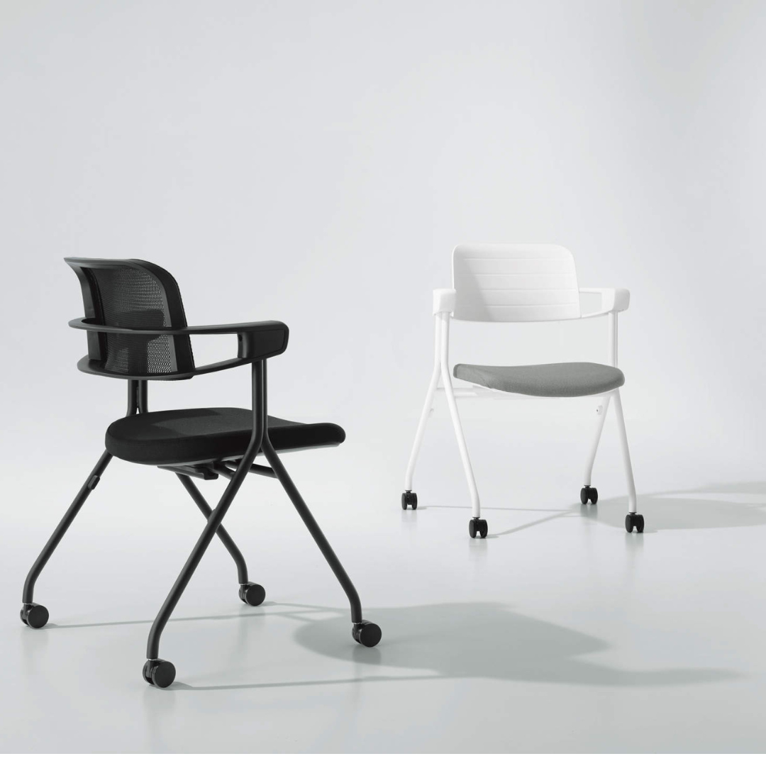 メッシュ背が軽快な印象を与え、空間を引き締めつつ圧迫感を抑制。ネスティング収納でレイアウト変更もスムーズです。