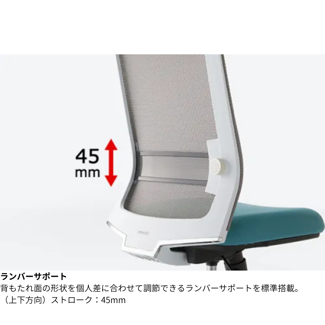 通気性に優れた背メッシュと、上下調節可能なランバーサポートが正しい姿勢をサポート。