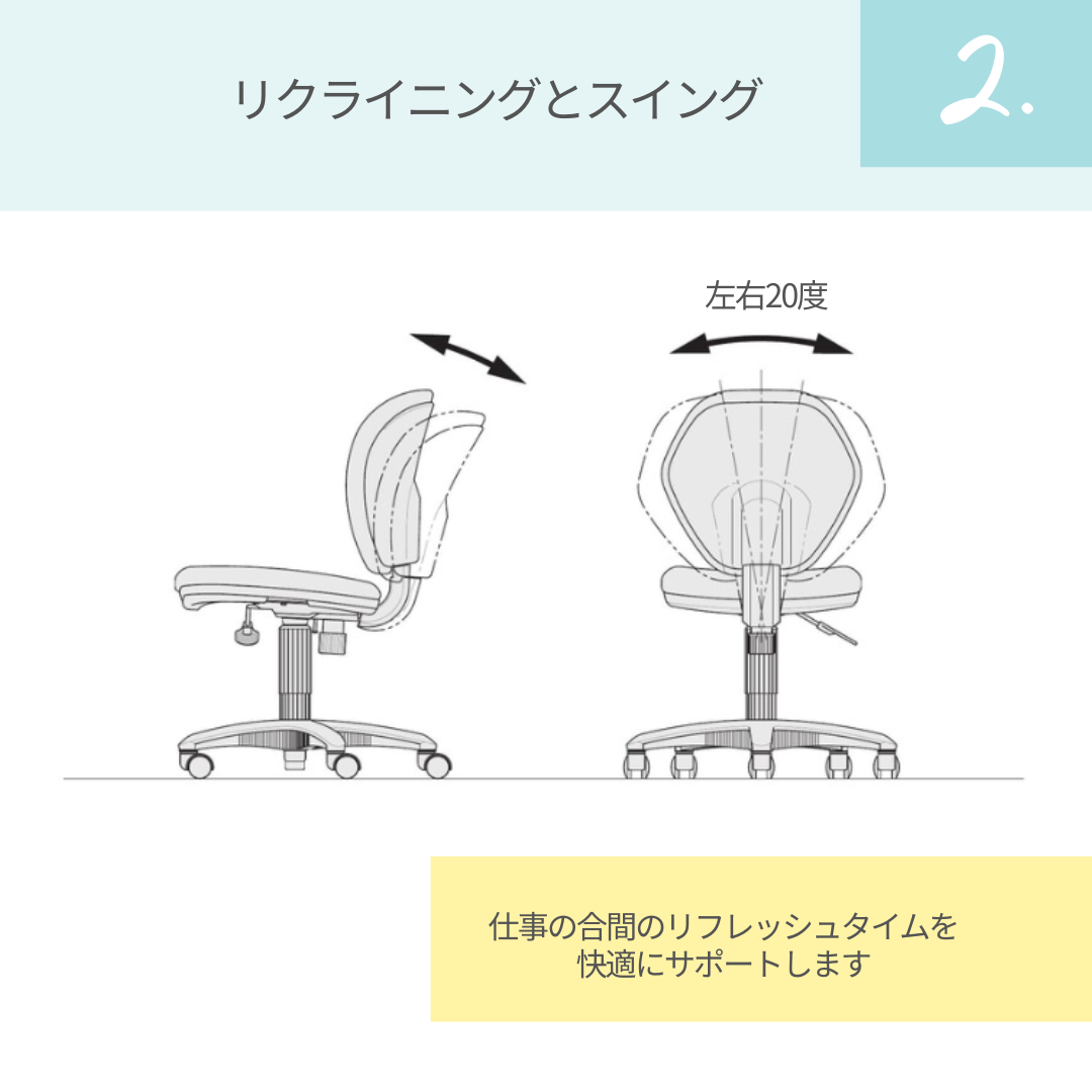 さらに適度に傾く背ロッキング機能で、集中とリフレッシュの切り替えもスムーズ。