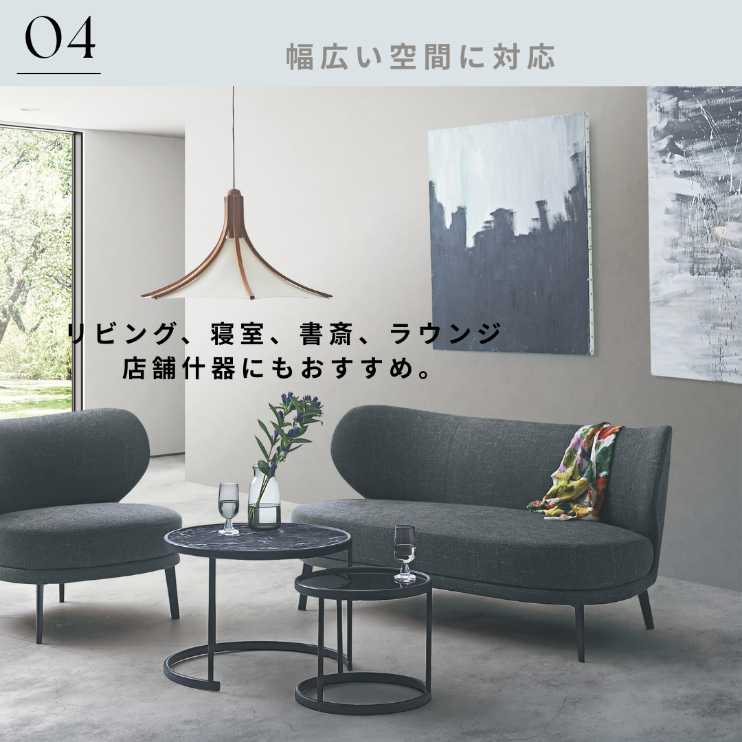 空間にやさしい印象を与え、リビングやラウンジを上質な雰囲気に演出します。