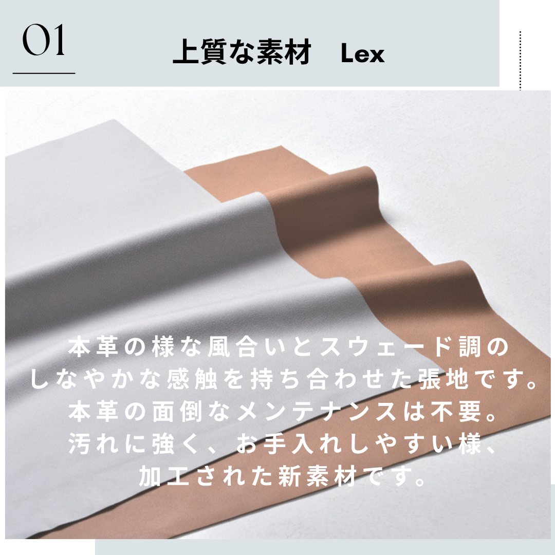 張地には本革のような高級感としなやかな手触りを持つレザークロス素材「Lex」を採用。汚れに強く、お手入れがしやすい素材で、家庭用はもちろん店舗やラウンジにも適しています。