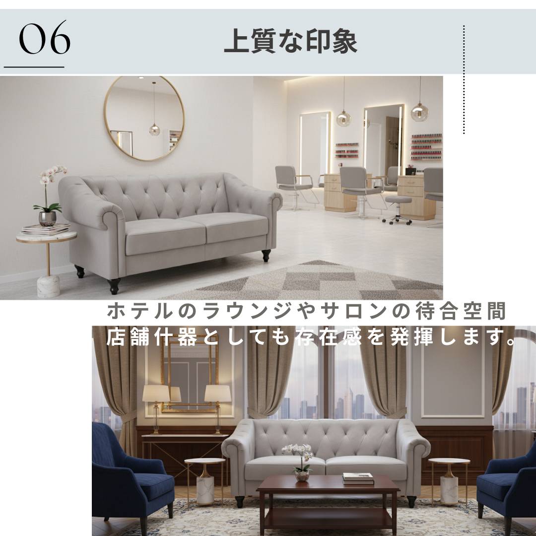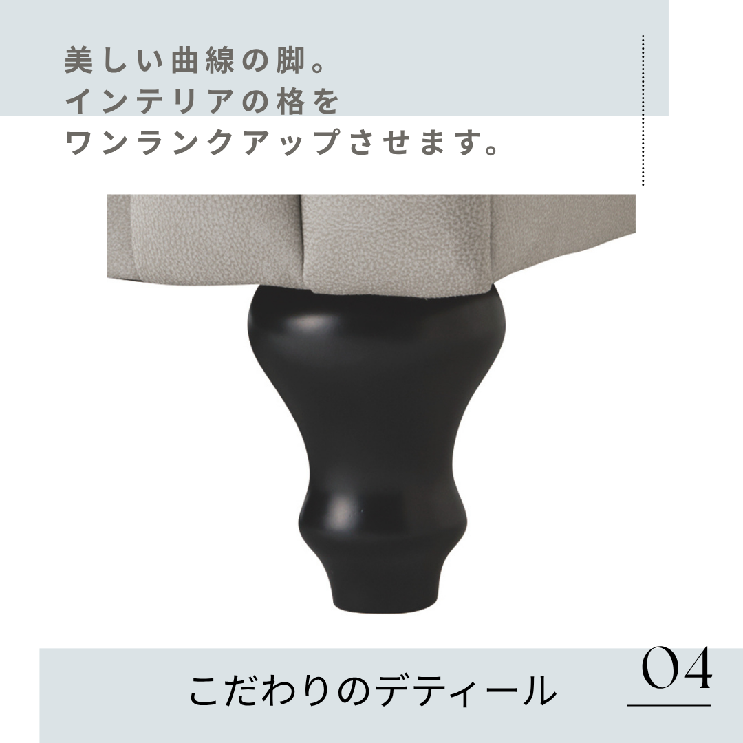 脚部には天然木(ラバーウッド)を使用。クラシックなデザインに自然素材の温かみが加わり、上質なインテリア空間を演出します。