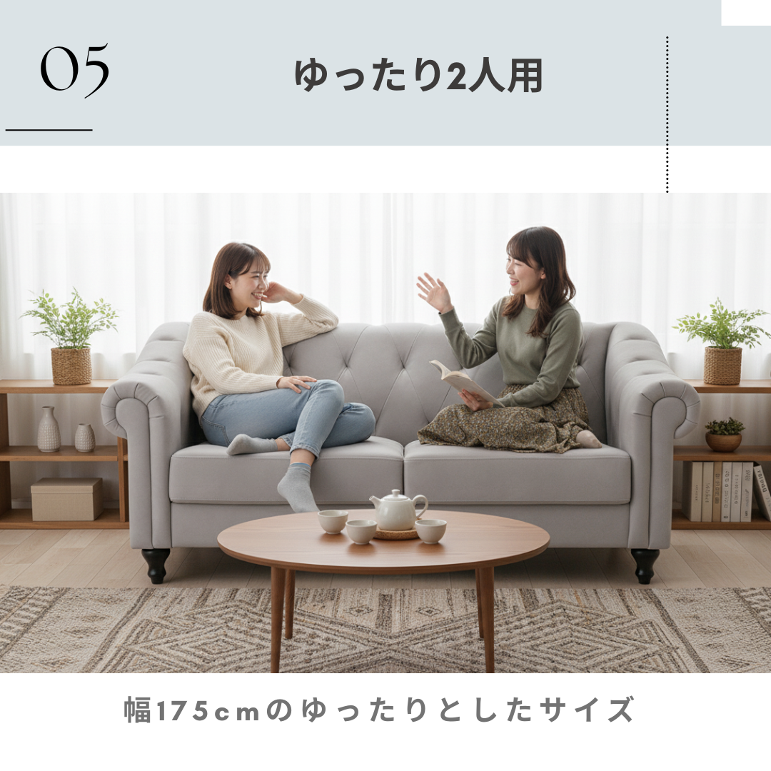 幅175cmのゆったりしたサイズで、2~3人でゆったり座れる設計。リビングのくつろぎスペースや応接空間にもおすすめのサイズ感です。