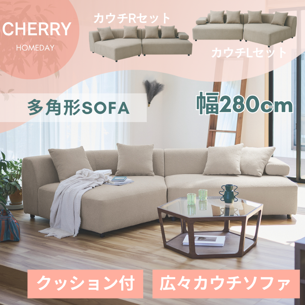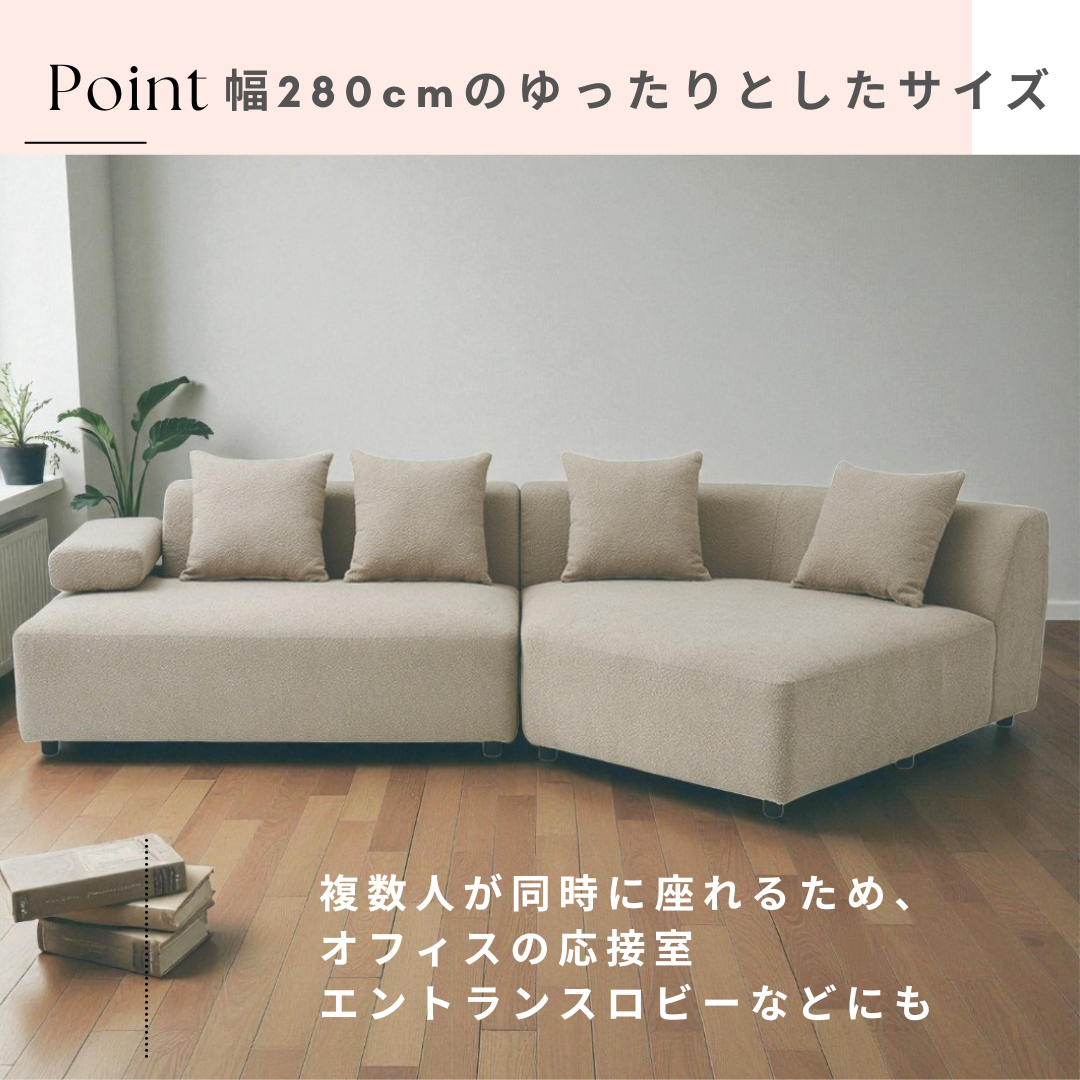 広々とした幅280cmの大型サイズで、家族みんながゆったりとくつろげるカウチソファ。横になっても余裕があり、リビングの主役になる存在感のあるサイズ感です。