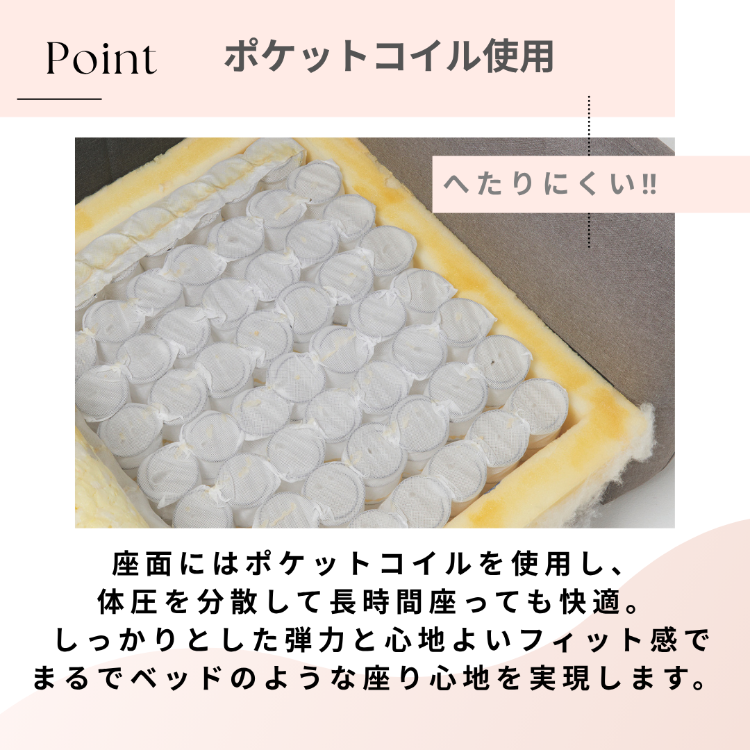 脚を伸ばしてくつろげるカウチタイプなので、映画鑑賞や読書、リラックスタイムにも最適。ゆったりとした座面設計で、長時間座っても快適な座り心地です。