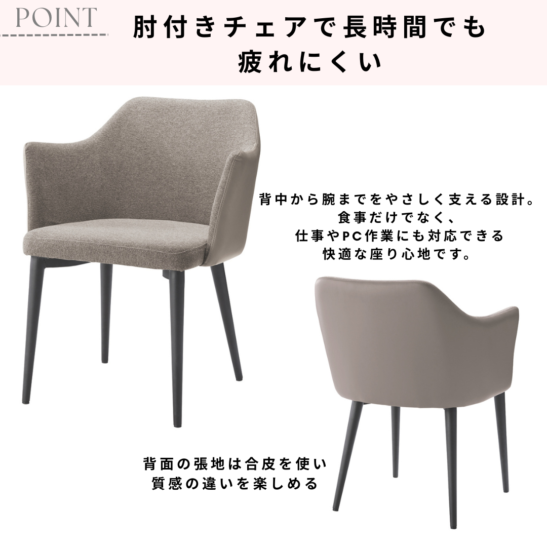 長時間座っても疲れにくく、食事や打ち合わせ、作業スペースにも快適です。