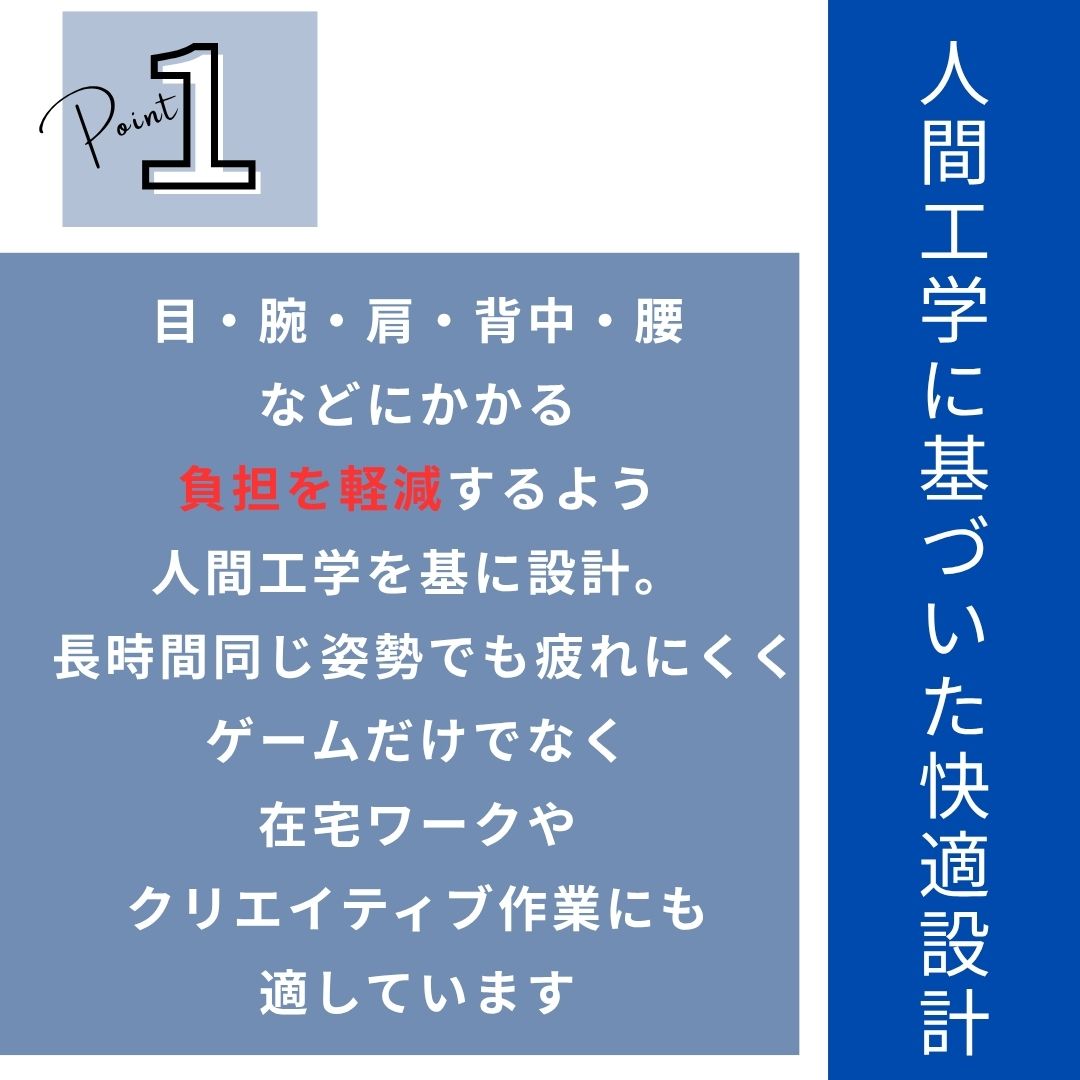 目・腕・肩・背中・腰など体へ負担を人間工学理論に基づく設計で軽減。