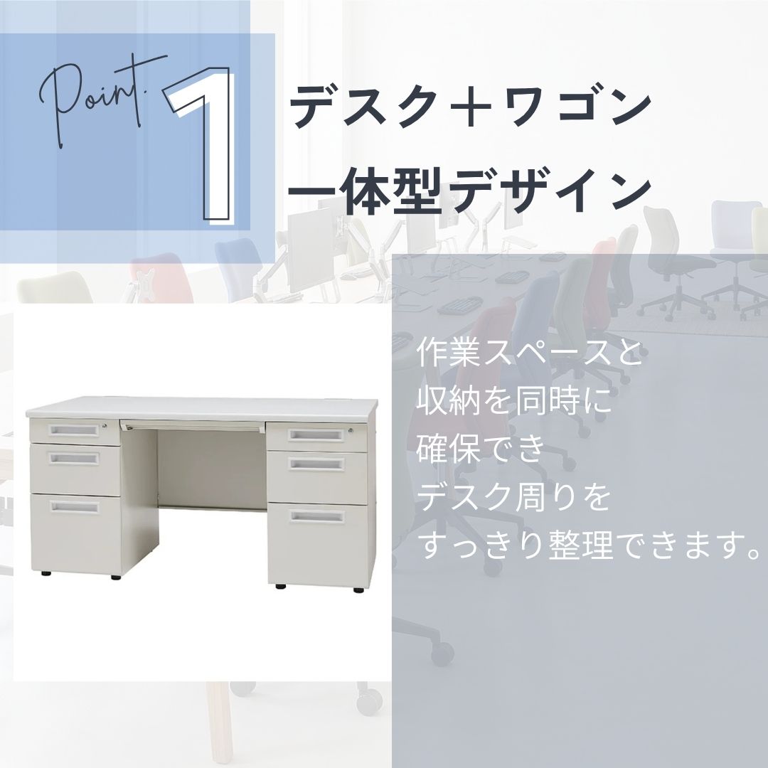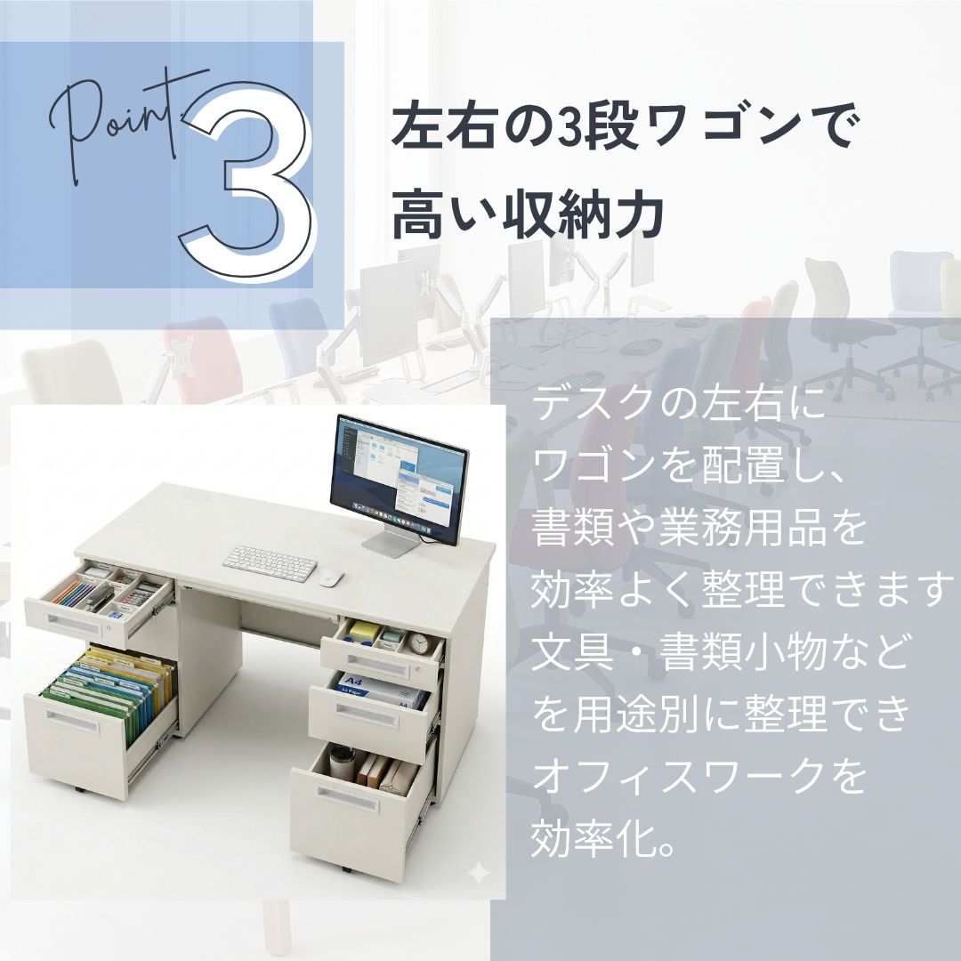 デスクの左右にワゴンを配置した設計で、書類や文具、業務用品などを効率よく整理できる高い収納力が特長です。